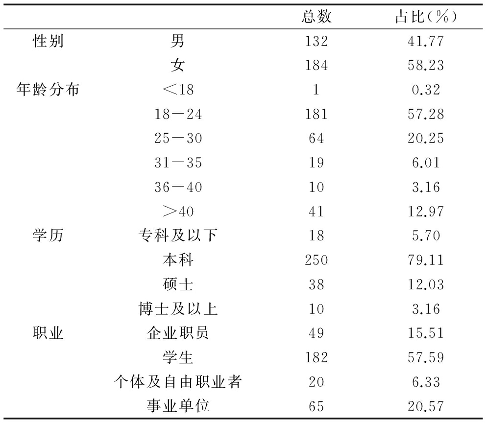总数占比(%)性别男13241.77女18458.23年龄分布<1810.3218-2418157.2825-306420.2531-35196.0136-40103.16>404112.97学历专科及以下185.70本科25079.11硕士3812.03博士及以上103.16职业企业职员4915.51学生18257.59个体及自由职业者206.33事业单位6520.57