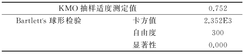 KMO抽样适度测定值0.752Bartlett's球形检验卡方值2.352E3自由度300显著性0.000