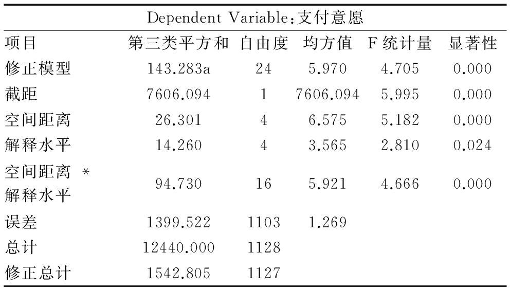 DependentVariable:支付意愿项目第三类平方和自由度均方值F统计量显著性修正模型143.283a245.9704.7050.000截距7606.09417606.0945.9950.000空间距离26.30146.5755.1820.000解释水平14.26043.5652.8100.024空间距离*解释水平94.730165.9214.6660.000误差1399.52211031.269总计12440.0001128修正总计1542.8051127