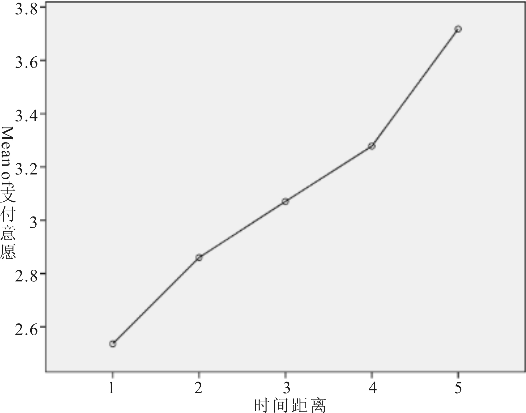 从基本的描述性统计来看,由SPSS得出不同时间距离下投资者支付意愿的平均值,从中可以看出,当时间距离越远时,投资者体现出的支付意愿越大。当被测者对项目的时间距离感知等于1时,支付意愿的平均值为2.54,相比而言,当被测者感知与众筹项目的时间距离为5时,即距离非常远时,支付意愿的平均值为3.72。根据被测者对时间距离的不同感知,支付意愿的变化如图2所示。从图中可看出,随着时间距离的增大,支付意愿也越强,说明时间距离与支付意愿呈正向关系。