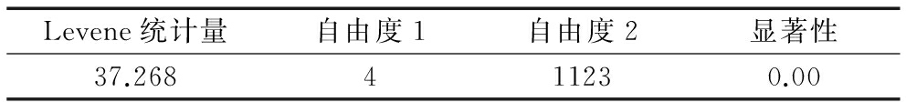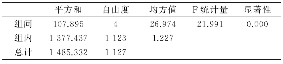 平方和自由度均方值F统计量显著性组间107.895426.97421.9910.000组内1377.43711231.227总计1485.3321127
