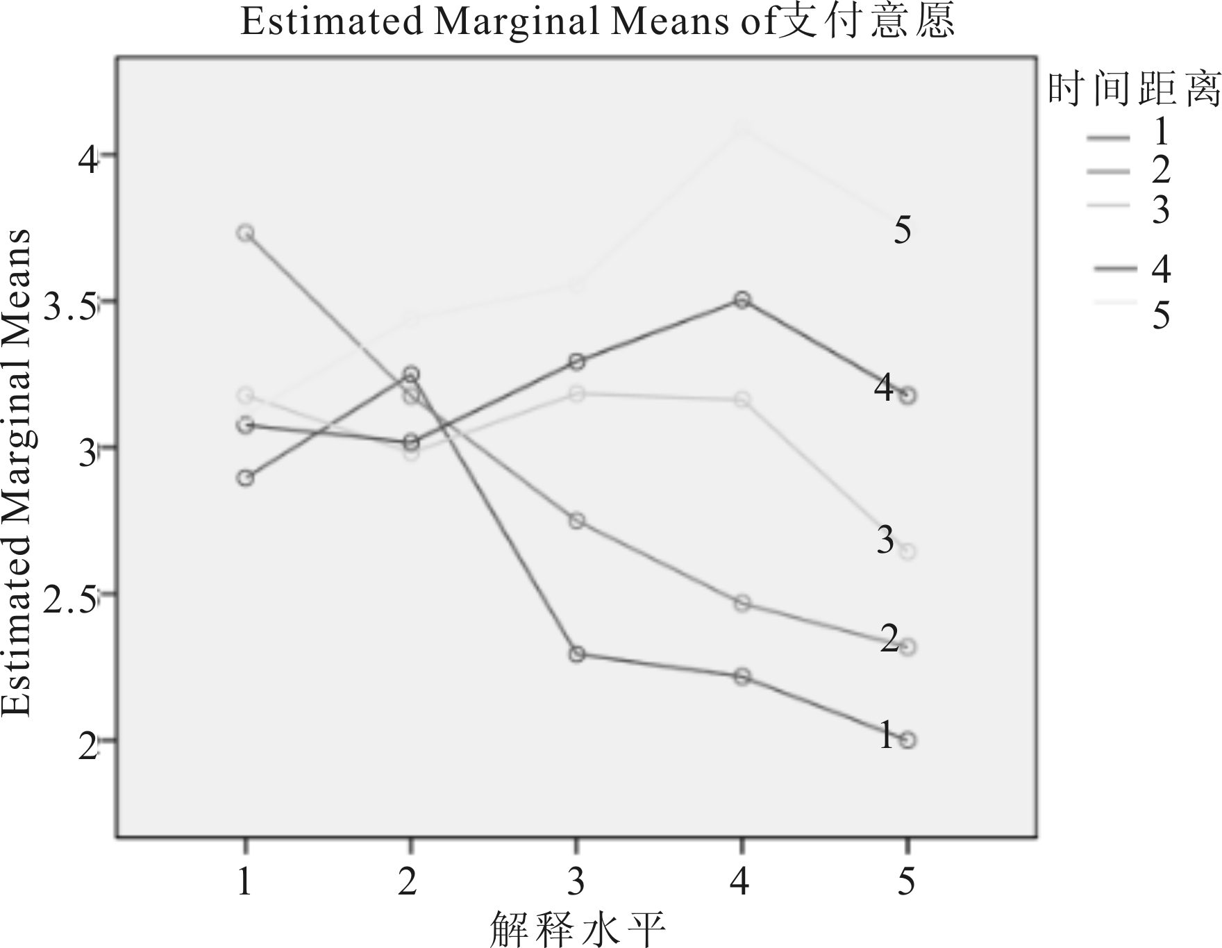 运用SPSS可得出时间距离与支付意愿的交互效应,如图4所示,可以进一步说明时间距离与解释水平存在交互作用,且从线1和线2可以看出,时间距离较近时,解释水平高则支付意愿变小;线4和线5都为上升趋势,说明时间距离大时,解释水平越高则支付意愿越强,从图上可验证假设H3a成立。