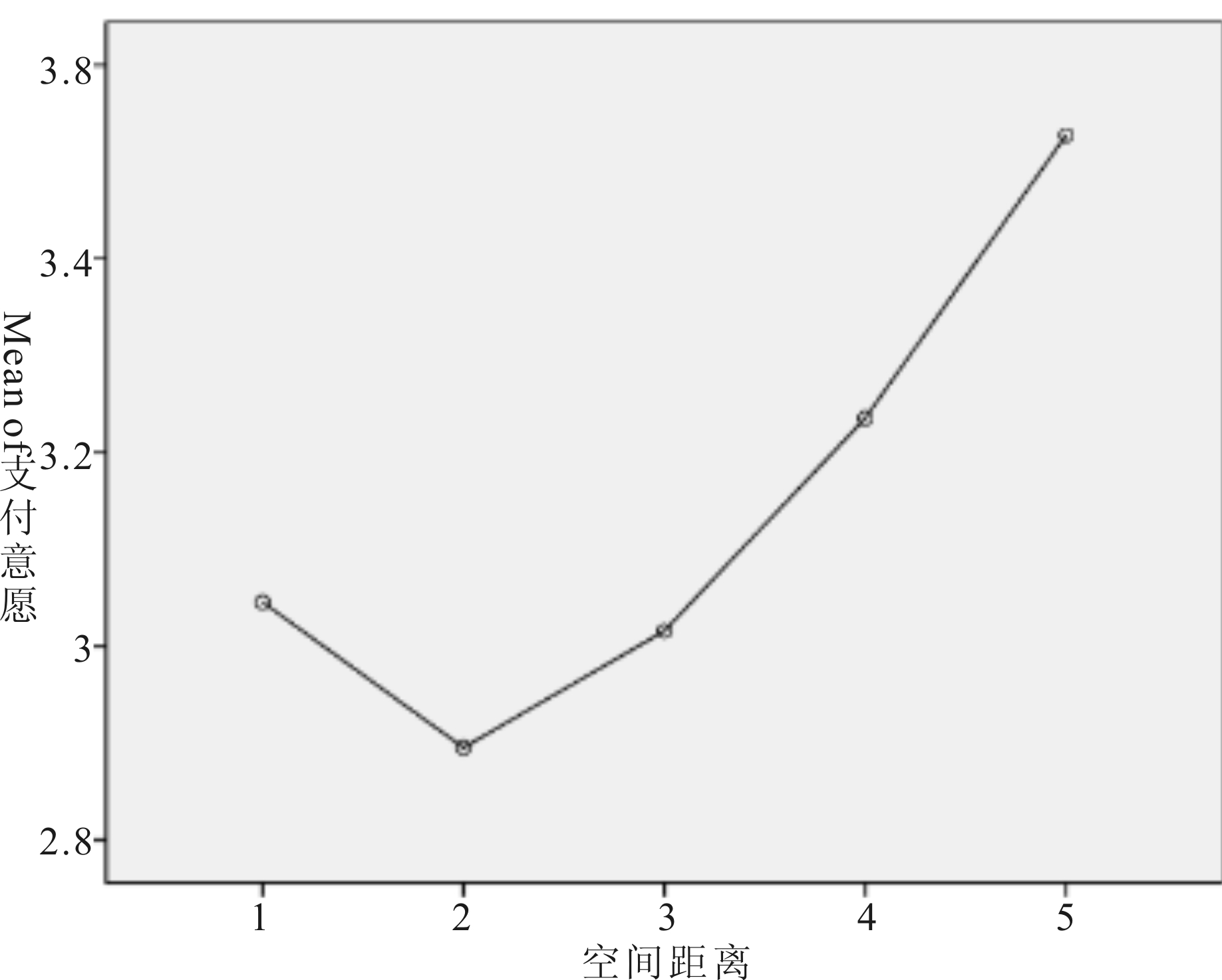 与验证时间距离对众筹投资者支付意愿的作用一样,首先运用SPSS对不同空间距离下的支付意愿进行基本统计分析,通过观察支付意愿均值在不同空间距离下的变化,直观验证空间距离是否作用于被测者的支付意愿。在被测者空间距离评分为1时,其支付意愿平均值为3.09,当空间距离为5时,其支付意愿平均值为3.53,即表示远空间距离较近空间距离下被测者的支付意愿更强,如图3所示。