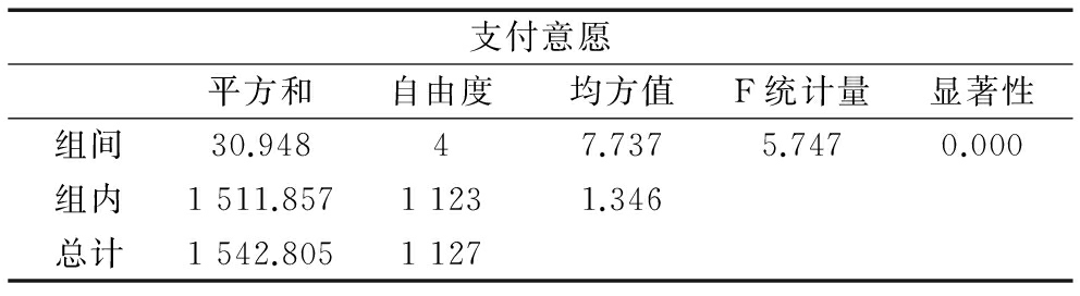 支付意愿平方和自由度均方值F统计量显著性组间30.94847.7375.7470.000组内1511.85711231.346总计1542.8051127