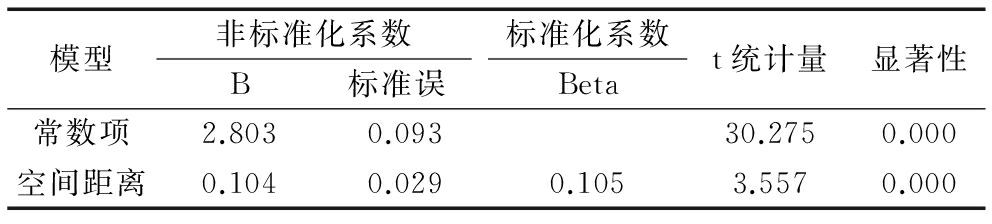 模型非标准化系数B标准误标准化系数Betat统计量显著性常数项2.8030.09330.2750.000空间距离0.1040.0290.1053.5570.000