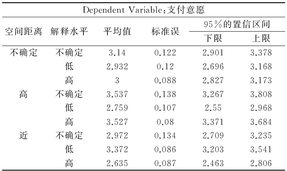 DependentVariable:支付意愿空间距离解释水平平均值标准误95%的置信区间下限上限不确定不确定3.140.1222.9013.378低2.9320.122.6963.168高30.0882.8273.173高不确定3.5370.1383.2673.808低2.7590.1072.552.968高3.5270.083.3713.684近不确定2.9720.1342.7093.235低3.3720.0863.2033.541高2.6350.0872.4632.806