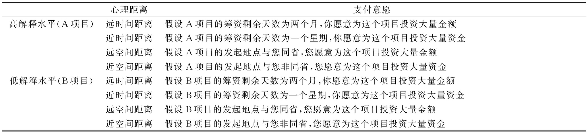 心理距离支付意愿高解释水平(A项目)远时间距离假设A项目的筹资剩余天数为两个月,你愿意为这个项目投资大量金额近时间距离假设A项目的筹资剩余天数为一个星期,你愿意为这个项目投资大量资金远空间距离假设A项目的发起地点与您同省,您愿意为这个项目投资大量金额近空间距离假设A项目的发起地点与您非同省,您愿意为这个项目投资大量资金低解释水平(B项目)远时间距离假设B项目的筹资剩余天数为两个月,你愿意为这个项目投资大量金额近时间距离假设B项目的筹资剩余天数为一个星期,你愿意为这个项目投资大量资金远空间距离假设B项目的发起地点与您同省,您愿意为这个项目投资大量金额近空间距离假设B项目的发起地点与您非同省,您愿意为这个项目投资大量资金