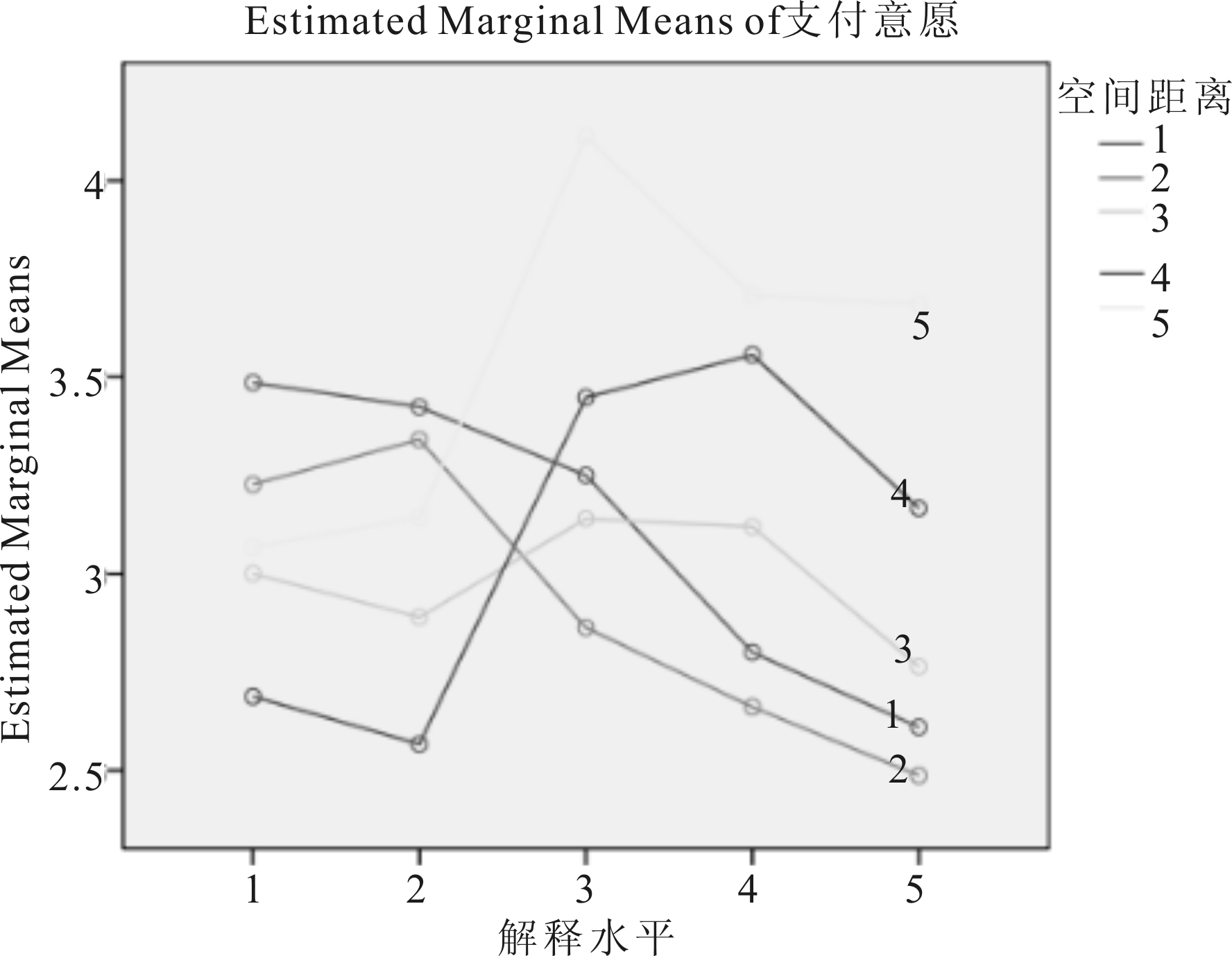 以上验证说明,空间距离与解释水平对支付意愿的交互作用在0.05的显著水平下通过验证,即空间距离与解释水平对支付意愿存在共同作用的假设也得到了验证。为了进一步体现空间距离与解释水平的交互效应,绘制了交互效应图,如图5所示。线1、2表示近空间距离,随着解释水平由低到高,其呈现下降趋势;线4、5表示远空间距离,随着解释水平升高其也呈现上升趋势,即在近空间距离下,测试者对于低解释水平项目的支付意愿更强;在远空间距离下,被测者对高解释水平项目的支付意愿更强,进一步验证假设H3b成立。