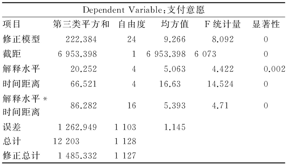 DependentVariable:支付意愿项目第三类平方和自由度均方值F统计量显著性修正模型222.384249.2668.0920截距6953.39816953.39860730解释水平20.25245.0634.4220.002时间距离66.521416.6314.5240解释水平*时间距离86.282165.3934.710误差1262.94911031.145总计122031128修正总计1485.3321127