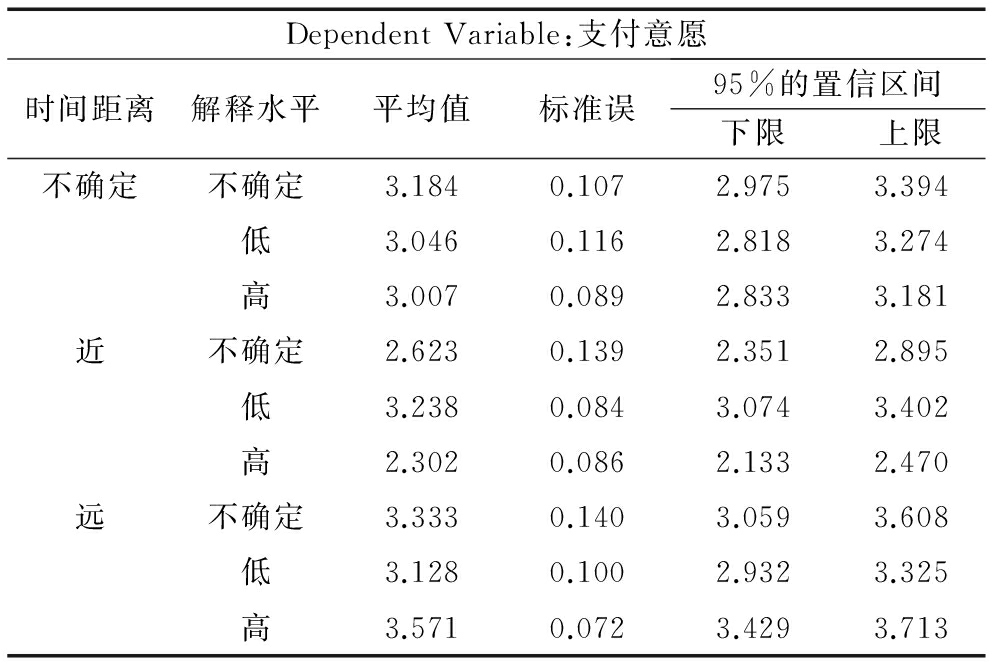 DependentVariable:支付意愿时间距离解释水平平均值标准误95%的置信区间下限上限不确定不确定3.1840.1072.9753.394低3.0460.1162.8183.274高3.0070.0892.8333.181近不确定2.6230.1392.3512.895低3.2380.0843.0743.402高2.3020.0862.1332.470远不确定3.3330.1403.0593.608低3.1280.1002.9323.325高3.5710.0723.4293.713