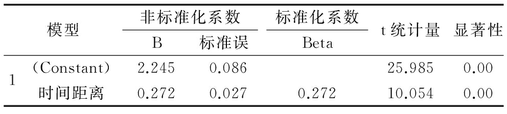 模型非标准化系数B标准误标准化系数Betat统计量显著性1(Constant)2.2450.08625.9850.00时间距离0.2720.0270.27210.0540.00
