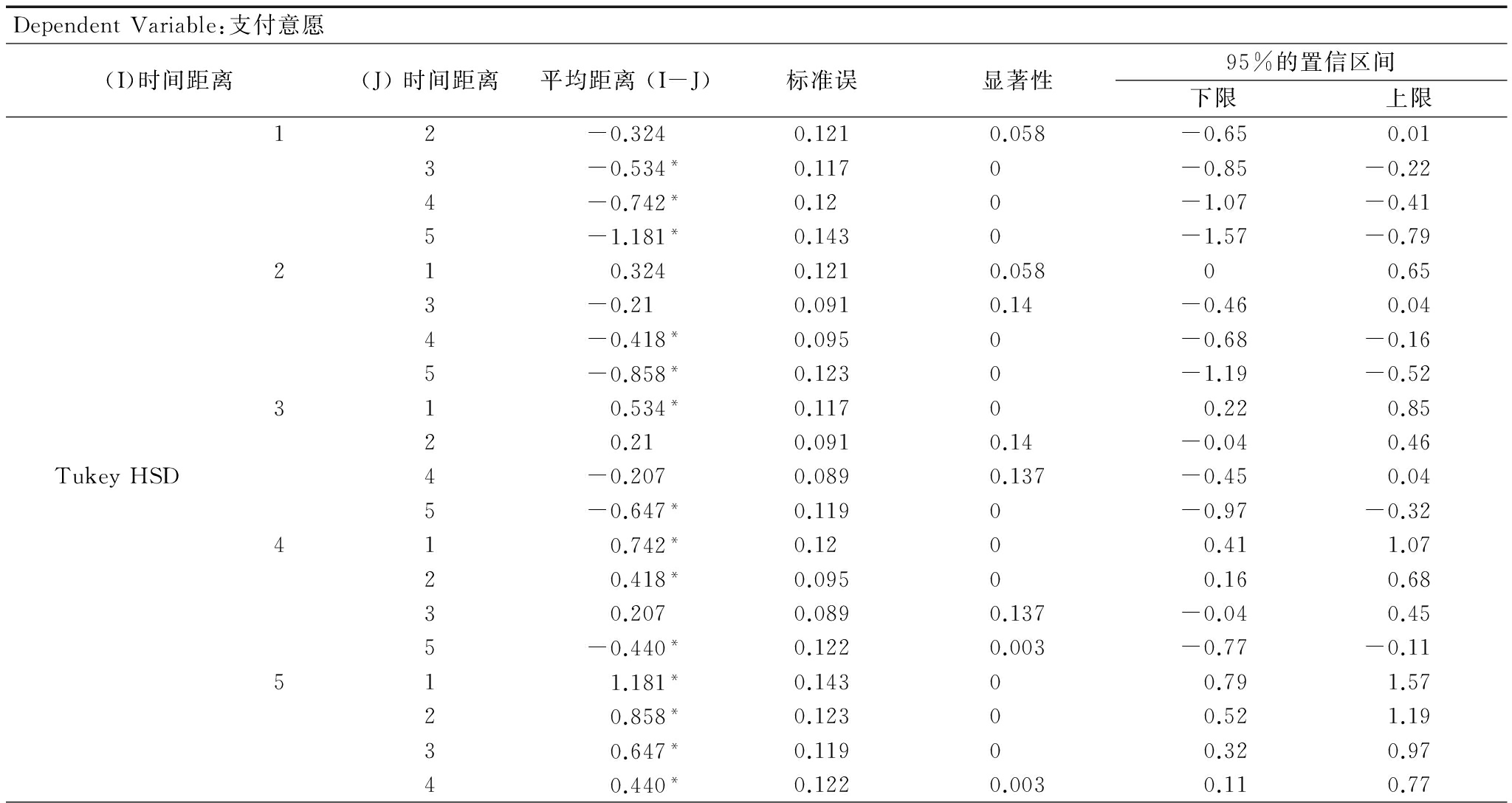 为了进一步观察不同心理距离下被测者支付意愿的差异,研究进行了多重比较。首先进行levene检验,检验数据是否具有齐性方差,如表10所示,如果通过了方差齐性检验,则选用Turkey法对不同时间距离下的投资者支付意愿进行多重比较。
