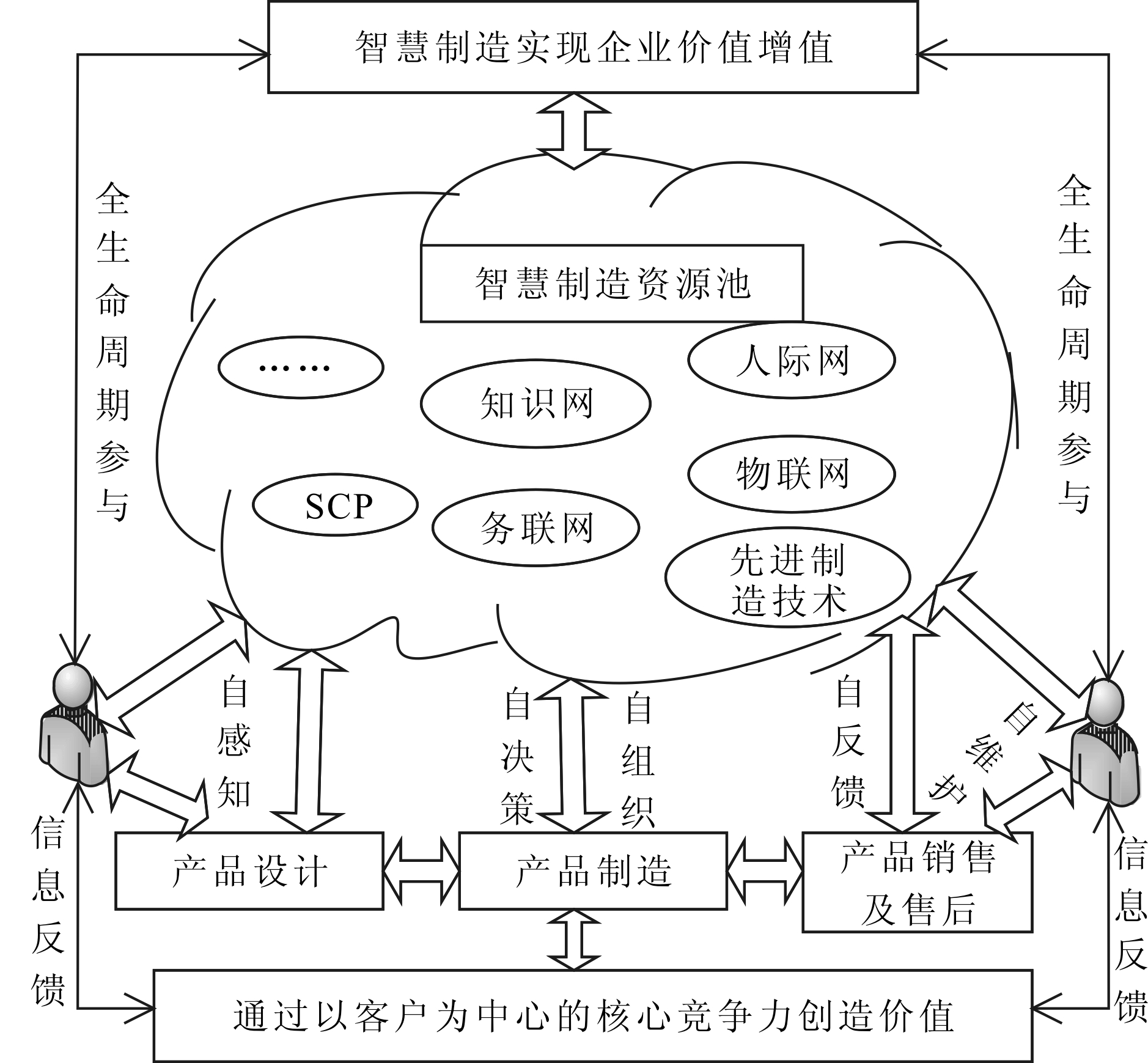 (2)组织方式上,智慧制造打破了以部门为单位的组织方式,强调顾客、服务组织、制造组织全部参与到产品全生命周期活动中,完成整个资源池的最优化配置,并向具有泛在感知、环境自适应、自组织、自决策、互操作和绿色、环保、安全、可靠的智慧化集成制造系统方向发展。