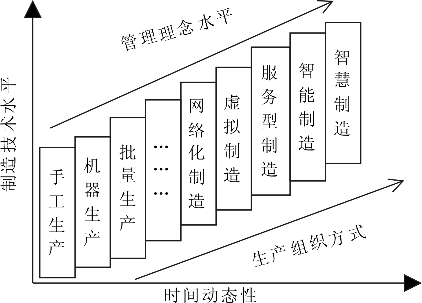 从制造业发展历程看,制造模式的每一次变革都是由制造技术进步、管理理念提升、生产组织方式改变共同决定的。如图1所示,按照制造技术水平、管理理念和生产组织方式,本文将制造模式发展归纳为以下几个阶段:手工生产、机器生产、批量生产、…网络化制造、虚拟制造、服务型制造、智能制造和智慧制造。