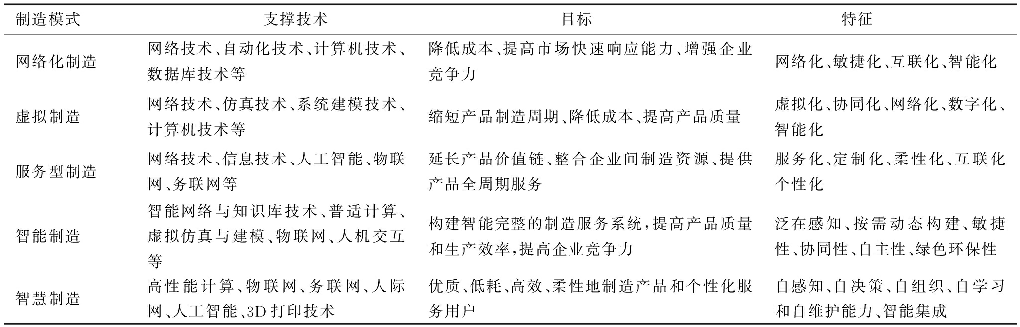 工业革命以前,主要是以手工生产为主的制造模式,产品质量由工人技艺水平决定。瓦特发明蒸汽机后,手工生产转向机器生产。随后,电气技术的发明和使用使制造业进入以汽车制造为代表的批量生产阶段。电子信息技术的广泛应用和自动化水平的不断提升,使规模化大批量生产成为主流。而随着市场环境的巨大变化,基于先进自动化技术和计算机技术发展起来的先进制造技术成为制造企业赢得竞争的关键,学术界相继出现了网络化制造、虚拟制造、服务型制造、智能制造、智慧制造等一系列先进制造概念。网络化制造是指企业采用先进的网络技术和制造技术,构建以快速响应市场特定需求和提高企业竞争力为目标的制造模式[13]。虚拟制造是以仿真技术和系统建模技术为基础,实现对制造系统信息流、物流、资金流、工作流等的全面模拟,生产出与真实产品具有一致特性的可视化虚拟产品制造模式[14]。服务型制造是以服务提供和服务转型为目的,通过产品和服务融合及客户参与实现制造资源整合的一种制造模式[15]。智能制造是在现代传感技术、信息通信技术及人工智能的基础上,通过人机交互实现产品设计、制造、管理及服务智能化的可持续发展制造模式[16]。智慧制造是以用户为中心,以物联网、务联网、人际网、知识网和先进制造技术为基础,以“产品+服务”为主导,基于知识运用的人、机、物、环境协同制造模式[17]。如表1所示,网络化制造、虚拟制造、服务型制造、智能制造和智慧制造五者的支撑技术有重叠,目标逐渐趋向一致性,制造模式在优势互补中趋向更加个性化、服务化、社会化、智能化、智慧化。