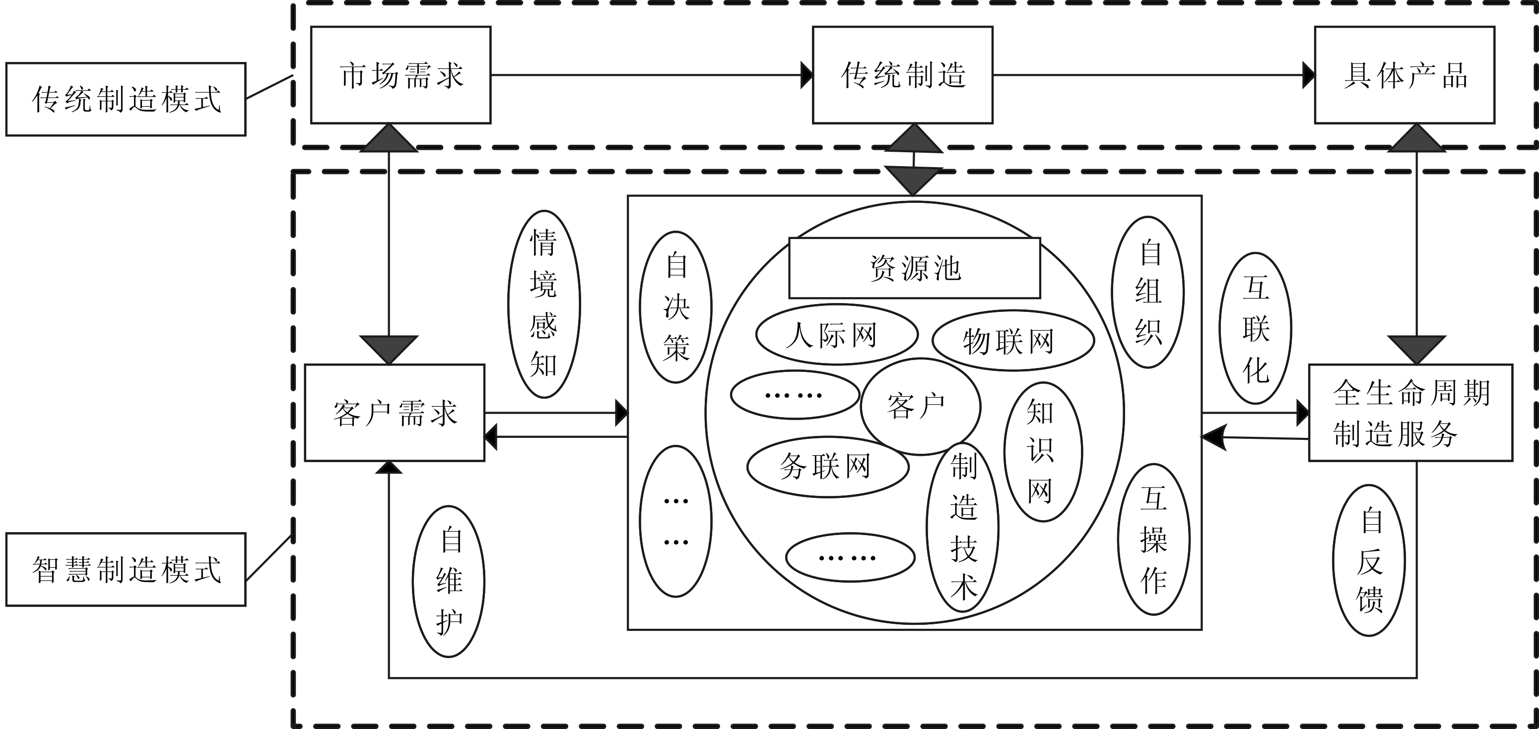 智慧制造模式与传统制造模式的区别如图2所示。从中可见,智慧制造模式是根据客户个性化需求,将各种制造资源智能自主地集成在一起组成资源池,在全生命周期中以客户为核心提供制造服务。这一模式不仅彻底改变了制造业产业链、价值链和产业模式,还摆脱了附加值低、技术含量低的困境[18]。