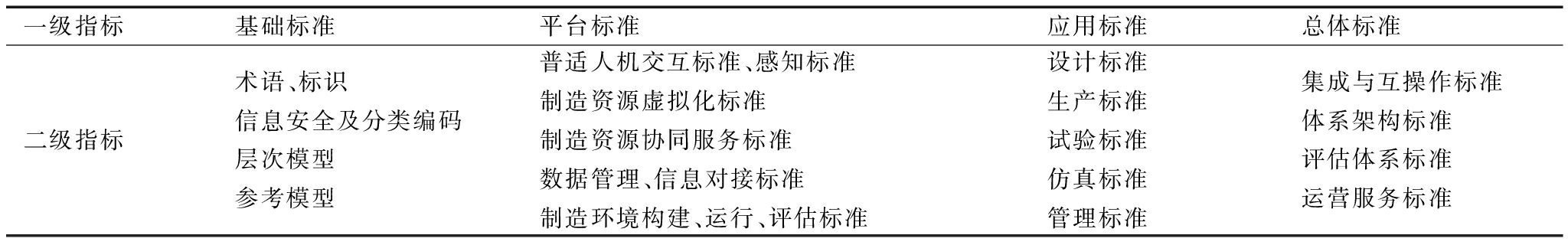 一级指标基础标准平台标准应用标准总体标准二级指标术语、标识信息安全及分类编码层次模型参考模型普适人机交互标准、感知标准制造资源虚拟化标准制造资源协同服务标准数据管理、信息对接标准制造环境构建、运行、评估标准设计标准生产标准试验标准仿真标准管理标准集成与互操作标准体系架构标准评估体系标准运营服务标准