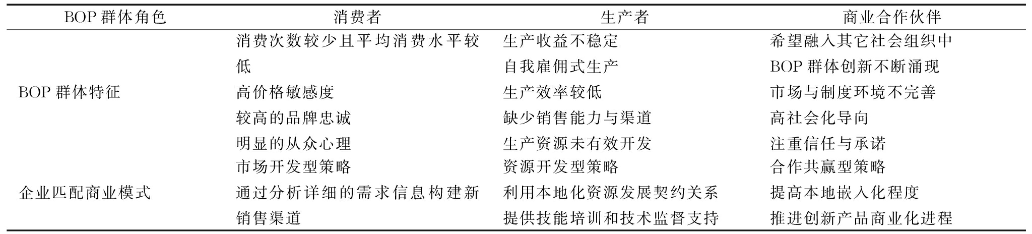 作为生产者,BOP群体大都从事农业生产活动,自然灾害等不可控因素容易造成生产收益的不稳定性。少数达到中小农业生产规模的人群,也大都采取自我雇佣模式,以一种非正式经济状态存在[19]。面对BOP群体生产和议价能力较低的现状,企业可以采取资源开发型策略。一方面,企业需要与BOP群体建立以市场机制为基础的契约关系,整合利用当地资源提高地方发展能力;另一方面,企业还需要提供技能培训和技术监督,确保创新群体生产要素、创新资源与企业价值链无缝对接。例如,格莱珉电话有限公司推出的“电话女士”项目,通过雇佣当地农村妇女,对其进行集中培训后,再派她们到村庄推广手机服务,在提高农村妇女收入的同时有助于消除城乡“数字鸿沟”。值得一提的是,资源开发型策略的实施势必增加企业成本投入,二者间的弱相关关系加大了实施难度。因此,企业可通过与政府、地方中介组织、NGO等机构建立联系,共同制定包容性创新解决方案,开发产品、服务和配送机制。表1为BOP群体不同身份对企业商业模式的探索。