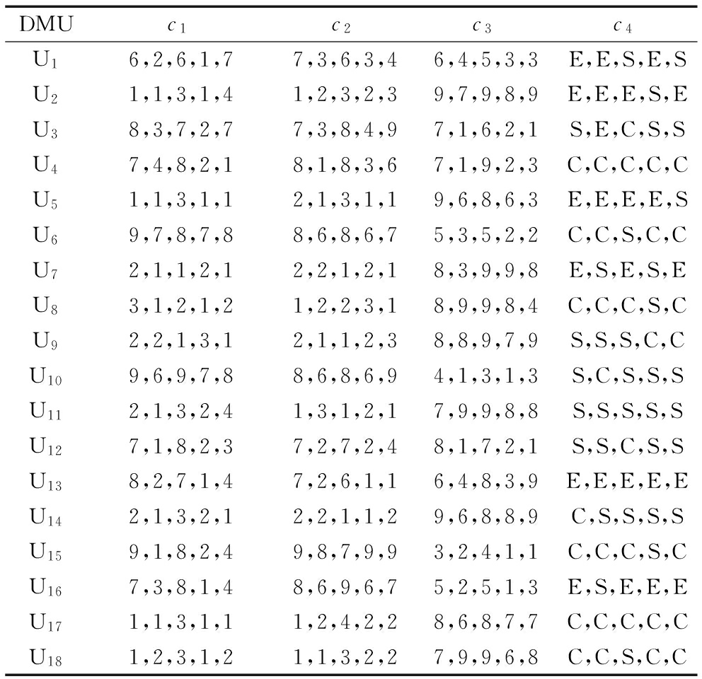 3种类型效率的设定值分别为:消减(C)=1,稳定(S)=3,放大(E)=5。依据整体判断策略,专家a1~a5给出的各团队、各指标初始评价信息如表1所示(属性权重ωj=0.3,0.2,0.4,0.1)。