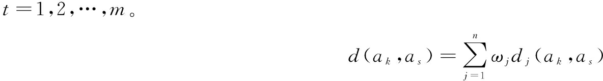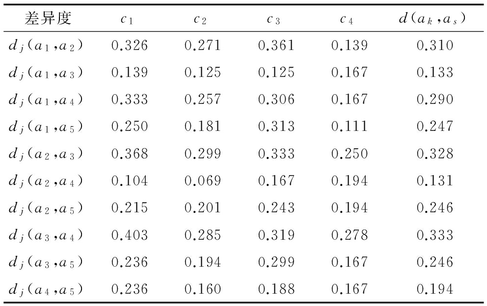 差异度c1c2c3c4d(ak,as)dj(a1,a2)0.3260.2710.3610.1390.310dj(a1,a3)0.1390.1250.1250.1670.133dj(a1,a4)0.3330.2570.3060.1670.290dj(a1,a5)0.2500.1810.3130.1110.247dj(a2,a3)0.3680.2990.3330.2500.328dj(a2,a4)0.1040.0690.1670.1940.131dj(a2,a5)0.2150.2010.2430.1940.246dj(a3,a4)0.4030.2850.3190.2780.333dj(a3,a5)0.2360.1940.2990.1670.246dj(a4,a5)0.2360.1600.1880.1670.194