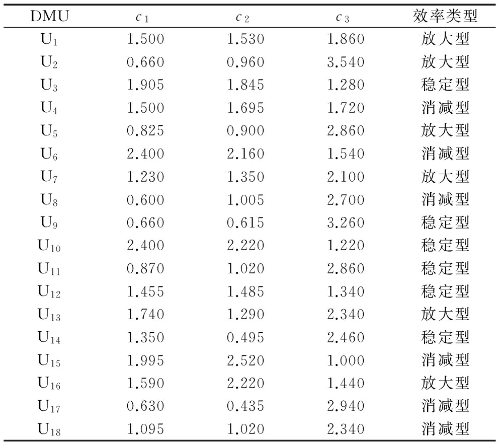 DMUc1c2c3效率类型U11.5001.5301.860放大型U20.6600.9603.540放大型U31.9051.8451.280稳定型U41.5001.6951.720消减型U50.8250.9002.860放大型U62.4002.1601.540消减型U71.2301.3502.100放大型U80.6001.0052.700消减型U90.6600.6153.260稳定型U102.4002.2201.220稳定型U110.8701.0202.860稳定型U121.4551.4851.340稳定型U131.7401.2902.340放大型U141.3500.4952.460稳定型U151.9952.5201.000消减型U161.5902.2201.440放大型U170.6300.4352.940消减型U181.0951.0202.340消减型