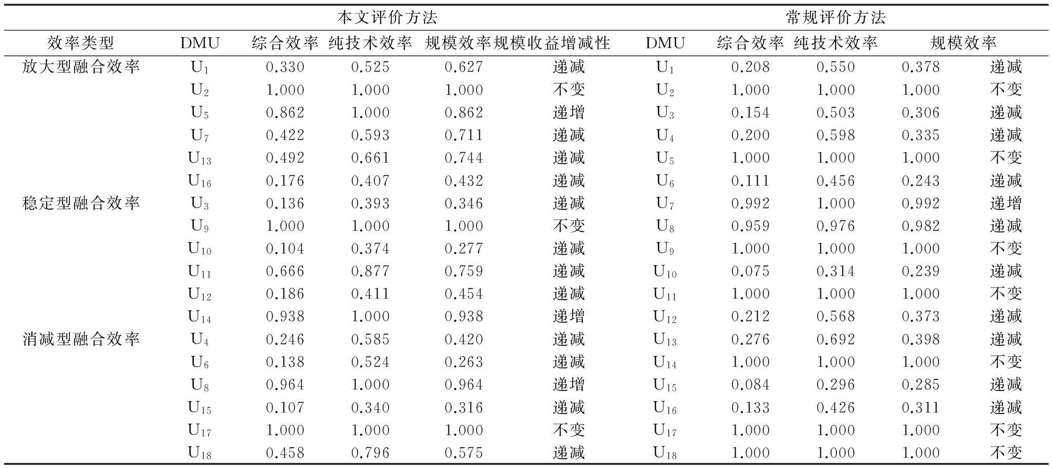 本文评价方法常规评价方法效率类型DMU综合效率纯技术效率规模效率规模收益增减性DMU综合效率纯技术效率规模效率放大型融合效率U10.3300.5250.627递减U10.2080.5500.378递减U21.0001.0001.000不变U21.0001.0001.000不变U50.8621.0000.862递增U30.1540.5030.306递减U70.4220.5930.711递减U40.2000.5980.335递减U130.4920.6610.744递减U51.0001.0001.000不变U160.1760.4070.432递减U60.1110.4560.243递减稳定型融合效率U30.1360.3930.346递减U70.9921.0000.992递增U91.0001.0001.000不变U80.9590.9760.982递减U100.1040.3740.277递减U91.0001.0001.000不变U110.6660.8770.759递减U100.0750.3140.239递减U120.1860.4110.454递减U111.0001.0001.000不变U140.9381.0000.938递增U120.2120.5680.373递减消减型融合效率U40.2460.5850.420递减U130.2760.6920.398递减U60.1380.5240.263递减U141.0001.0001.000不变U80.9641.0000.964递增U150.0840.2960.285递减U150.1070.3400.316递减U160.1330.4260.311递减U171.0001.0001.000不变U171.0001.0001.000不变U180.4580.7960.575递减U181.0001.0001.000不变