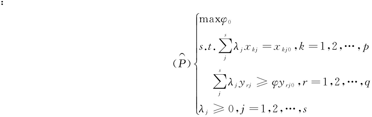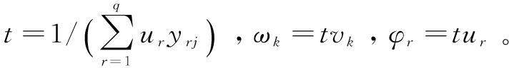 输入、输出指标的权向量分别为v=(v1,v2,…,vp)T,u=(u1,u2,…,uq)T,输入输出指标的赋值即基于多属性群决策达到群体意见一致度的专家判定信息集结。则对第j0个决策单元DMUj0进行相对效率评价的基于多属性群决策的CCR-O模型为