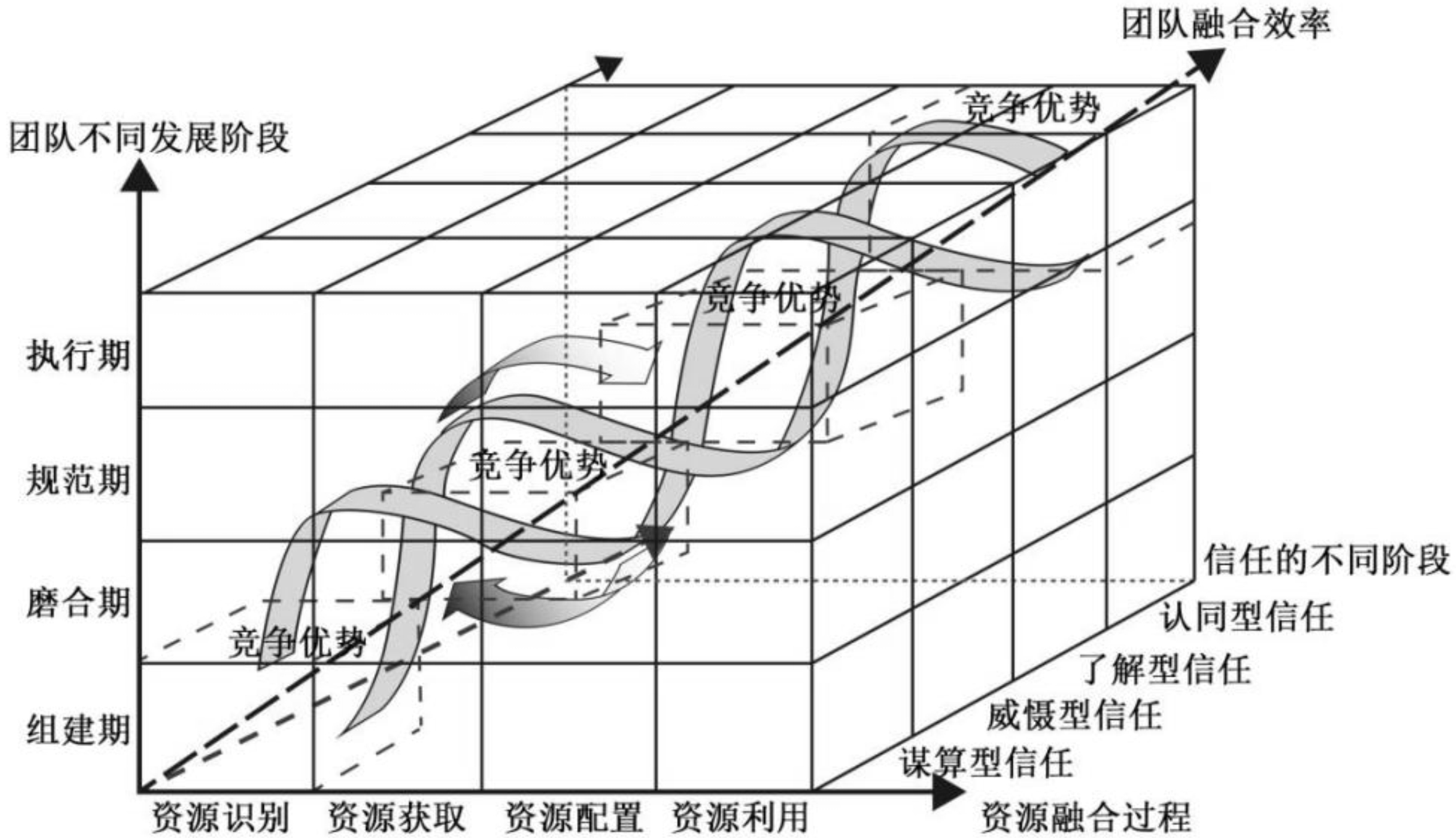 在网络型创新团队组建初期和磨合期,团队的资源融合与协同合作基本处于被动适应阶段,整合协同的层次、对象以内部为主,其组织学习能力、技术创新能力和竞争力还较弱。随着团队的不断发展,团队积极地对所获取的资源进行优化配置和利用,重构新的资源体系,在吸收、消化引进技术与经验的基础上,加强与外部组织间的联盟合作,形成多元主体联合创新、协同推进的局面,团队学习能力逐步提高,网络式创新效应将得到较好发挥[15]。在保持低成本、差异化竞争优势的基础上,团队的优势将日益凸显,竞争力逐渐增强,自主创新能力也将大幅提升,使得团队在动态环境中保持持续竞争优势[16]。在获取阶段性优势后,借助团队凝聚力和团队间信任,网络型创新团队会继续实现新一轮资源整合和发展,使其能力跃升到更高层次,从而进入新的自主发展平台。另一方面,网络型创新团队竞争优势的不断提高,并不代表团队资源融合效率会一直增加,即使处于规范期认同型信任的团队状态之下,资源融合效率也可能受到外界环境或者内部激励等因素的影响而导致低效率,只有当一切因素和条件达到平衡和谐状态时,效率才是最高的。因此,网络型创新团队的资源融合效率是动态螺旋双向上升的,既有可能增加,也有可能降低,不是简单的线性增加。资源融合、团队发展与信任演变之间的耦合关系如图3所示。