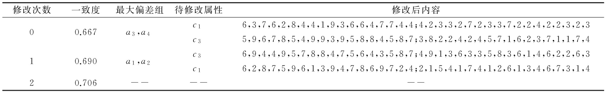因为δ<λ,且g<g0,则该决策未通过一致性检验,根据上文“3.3”给出的专家判定信息多轮调整策略,上述专家对初始评价信息作出3次调整的相关检验指标如表3所示。