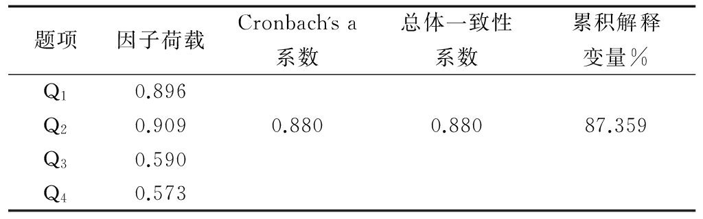 题项因子荷载Cronbach'sa系数总体一致性系数累积解释变量%Q10.896Q20.9090.8800.88087.359Q30.590Q40.573