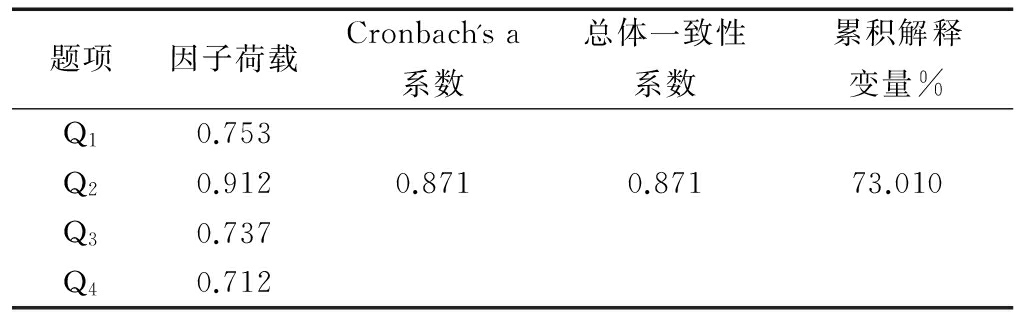 题项因子荷载Cronbach'sa系数总体一致性系数累积解释变量%Q10.753Q20.9120.8710.87173.010Q30.737Q40.712