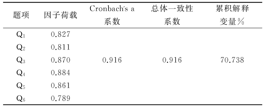 题项因子荷载Cronbach'sa系数总体一致性系数累积解释变量%Q10.827Q20.811Q30.8700.9160.91670.738Q40.884Q50.861Q60.789