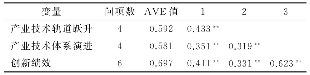 信度检验一般都是验证两个系数:Cronbach's a与一致性系数,效度是否合理则采用因子检验方法。本研究利用SPSS21统计分析软件对调查数据进行信度与效度检测[14]。表1~3结果表明,产业技术轨道、产业技术体系演进、创新绩效等变量的Cronbach's a系数、一致性系数均大于0.8,说明数据是可信的。同时,统计分析结果表明,产业技术轨道跃升、产业技术体系演进、创新绩效均获得了特征值大于1的因子。因此,问卷变量设置合理。解释变量率均大于70%,效度检验通过。如表4所示,AVE值均大于0.5,表明收敛效度和判断效度均较为合理,检验通过。