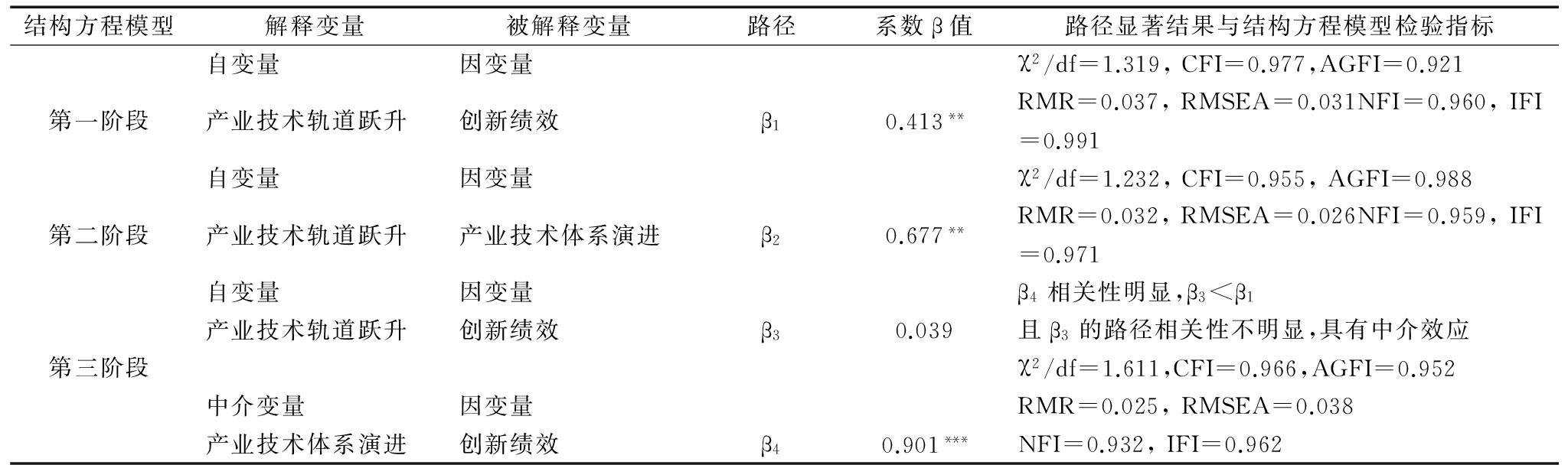 根据现有研究成果,产业技术轨道跃升、产业技术体系演进和创新绩效等相关变量的信度与效度检验均得以通过。根据既有研究假设,构建相关理论模型并运用AMOS软件对各个变量关系进行结构方程模型检验,特别是对产业技术体系演进的中介效应进行检验[13]。本研究构建了三阶段的不同结构方程模型,第一阶段以产业技术轨道跃升为自变量,以创新绩效为因变量;第二阶段以产业技术轨道跃升为自变量,以产业技术体系演进为因变量;第三阶段以产业技术轨道跃升为自变量,以产业技术体系演进为中介变量,以创新绩效为因变量展开实证研究,以此探讨产业技术体系演进的中介作用,结果如表5所示。
