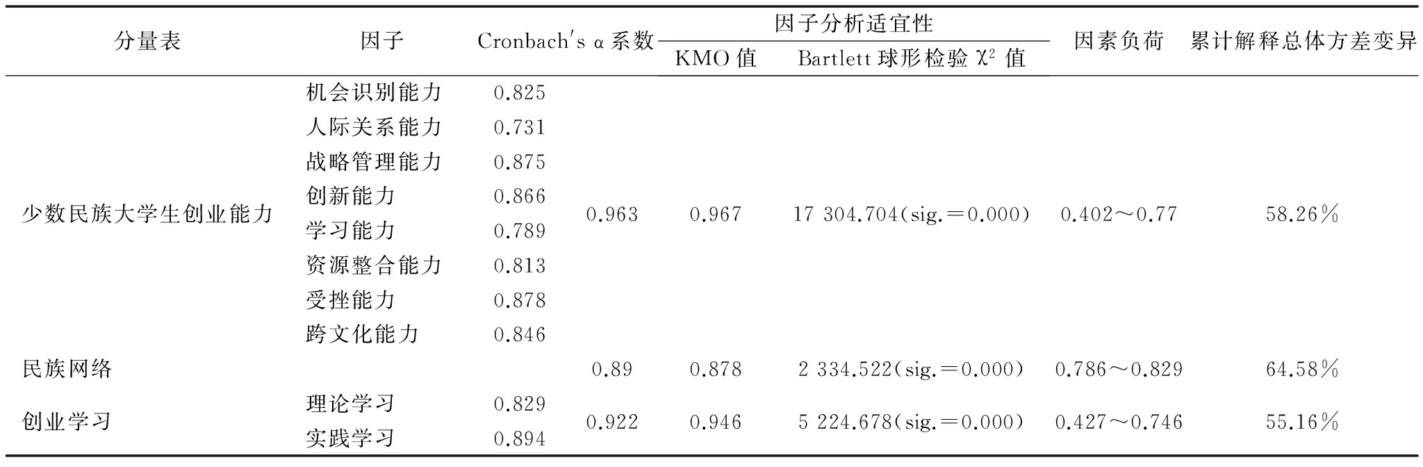 (2)量表信效度分析。运用SPSS19.0统计软件分析,各变量的Cronbach′s α值均大于0.7,达到较高水平,表明量表具有良好信度。量表各因子的KMO值均大于0.7,Bartlett球形检验结果在0.001水平上显著,表明量表适合进行因子分析。探索性因子分析结果显示,少数民族大学生创业能力量表抽取8个因子,累计可解释变异总量的58.258%,因素负荷在0.402~0.770之间;民族网络量表抽取1个因子,累计可解释变异总量的64.581%,因素负荷在0.786~0.829之间;创业学习量表抽取2个因子,累计可解释变异总量的55.163%,因素负荷在0.427~0.746之间,表明各量表具有良好的内部结构,具体见表2。