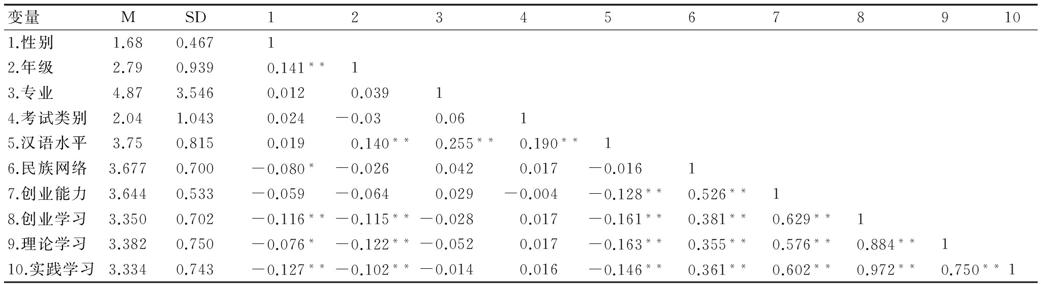 变量MSD123456789101.性别1.680.46712.年级2.790.9390.141**13.专业4.873.5460.0120.03914.考试类别2.041.0430.024-0.030.0615.汉语水平3.750.8150.0190.140**0.255**0.190**16.民族网络3.6770.700-0.080*-0.0260.0420.017-0.01617.创业能力3.6440.533-0.059-0.0640.029-0.004-0.128**0.526**18.创业学习3.3500.702-0.116**-0.115**-0.0280.017-0.161**0.381**0.629**19.理论学习3.3820.750-0.076*-0.122**-0.0520.017-0.163**0.355**0.576**0.884**110.实践学习3.3340.743-0.127**-0.102**-0.0140.016-0.146**0.361**0.602**0.972**0.750**1