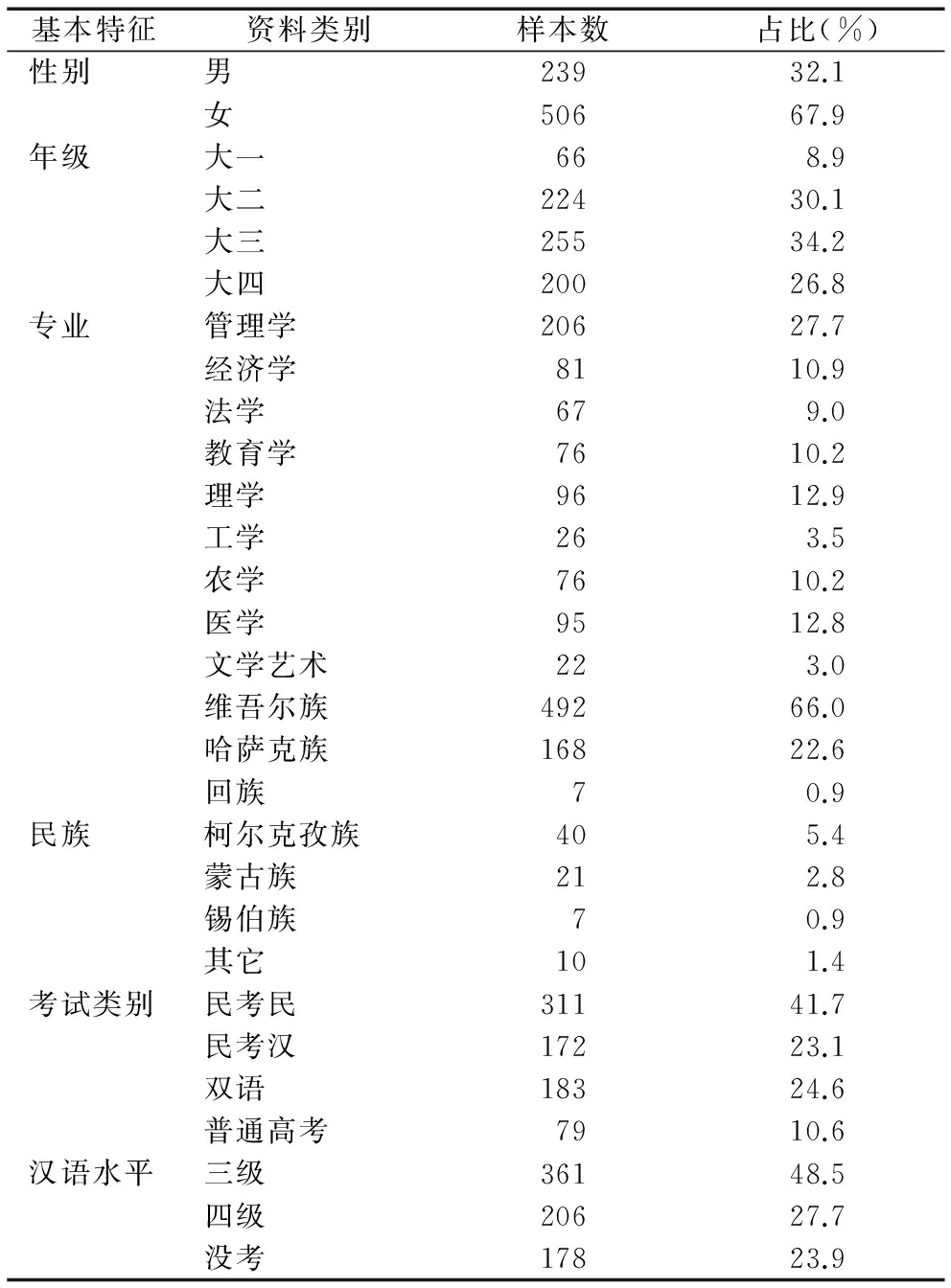 2016年4-6月,在对新疆部分高校访谈的基础上,本文采用问卷调查法收集数据,选取石河子大学、新疆财经大学、新疆师范大学、新疆农业职业技术学院、昌吉学院等7所有代表性的高校,调查对象为少数民族在校大学生,现场发放问卷800份,回收有效问卷745份,问卷有效率为93.1%,具体见表1。