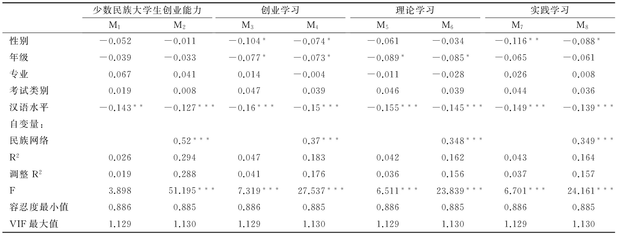 表5 民族网络对少数民族大学生创业能力和创业学习的回归分析结果 (N=745)