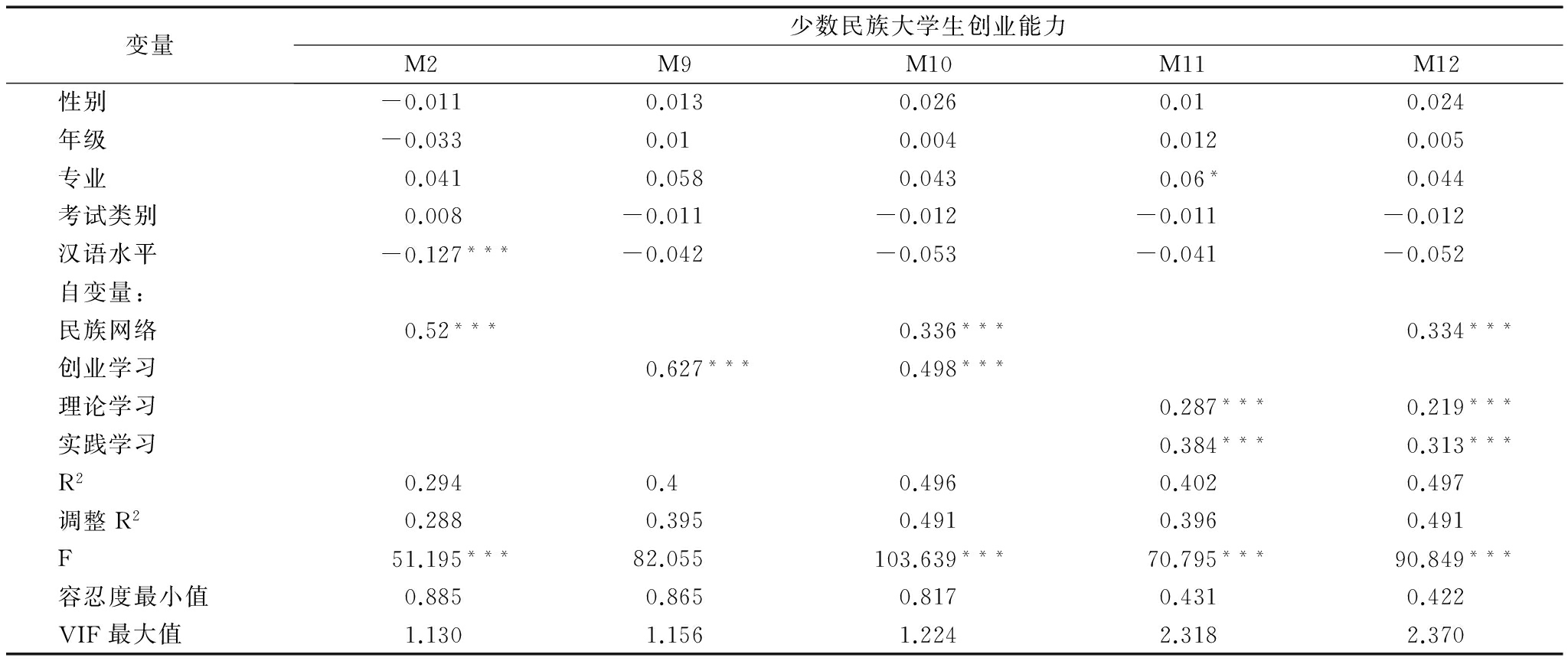 变量少数民族大学生创业能力M2M9M10M11M12性别-0.0110.0130.0260.010.024年级-0.0330.010.0040.0120.005专业0.0410.0580.0430.06*0.044考试类别0.008-0.011-0.012-0.011-0.012汉语水平-0.127***-0.042-0.053-0.041-0.052自变量:民族网络0.52***0.336***0.334***创业学习0.627***0.498***理论学习0.287***0.219***实践学习0.384***0.313***R20.2940.40.4960.4020.497调整R20.2880.3950.4910.3960.491F51.195***82.055103.639***70.795***90.849***容忍度最小值0.8850.8650.8170.4310.422VIF最大值1.1301.1561.2242.3182.370