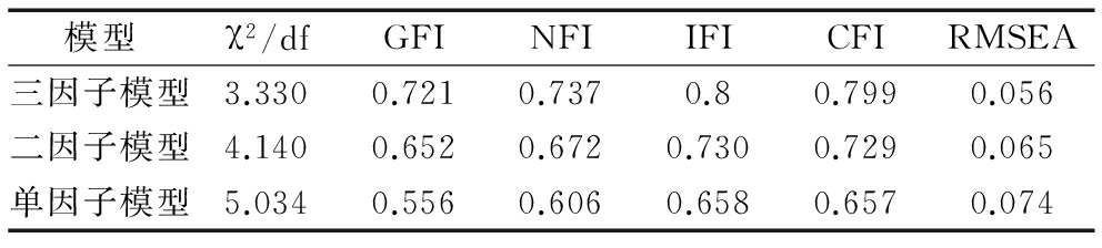 模型χ2/dfGFINFIIFICFIRMSEA三因子模型3.3300.7210.7370.80.7990.056二因子模型4.1400.6520.6720.7300.7290.065单因子模型5.0340.5560.6060.6580.6570.074
