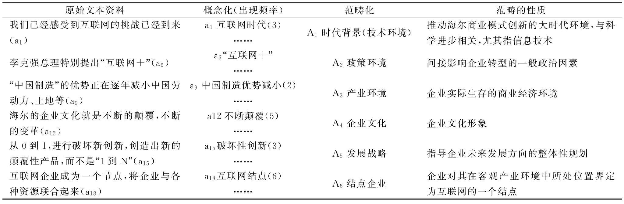 原始文本资料概念化(出现频率)范畴化范畴的性质我们已经感受到互联网的挑战已经到来(a1)a1互联网时代(3)……A1时代背景(技术环境)推动海尔商业模式创新的大时代环境,与科学进步相关,尤其指信息技术李克强总理特别提出“互联网+”(a6)a6“互联网+”……A2政策环境间接影响企业转型的一般政治因素“中国制造”的优势正在逐年减小中国劳动力、土地等(a9)a9中国制造优势减小(2)……A3产业环境企业实际生存的商业经济环境海尔的企业文化就是不断的颠覆,不断的变革(a12)a12不断颠覆(5)……A4企业文化企业文化形象从0到1,进行破坏新创新,创造出新的颠覆性产品,而不是“1到N”(a15)a15破坏性创新(3)……A5发展战略指导企业未来发展方向的整体性规划互联网企业成为一个节点,将企业与各种资源联合起来(a18)a18互联网结点(6)……A6结点企业企业对其在客观产业环境中所处位置界定为互联网的一个结点