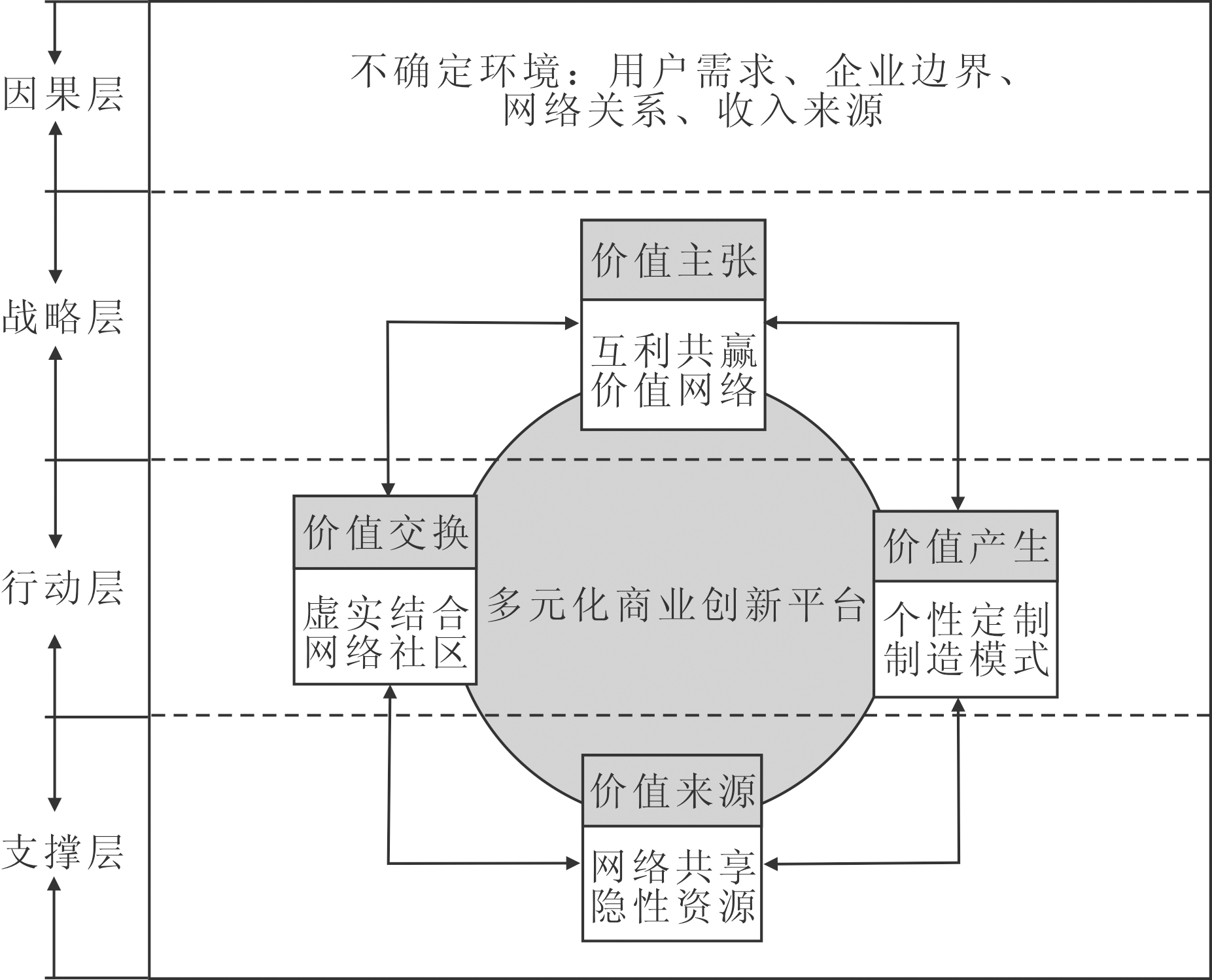 本文运用扎根理论,通过开放性译码、主轴性译码、选择性译码三重译码,整理出海尔商业模式创新线索,受系统理论启发,建立因果层-战略层-行动层-支撑层交互影响的时空层次结构,其中多元化商业创新平台是该结构的核心,如图1所示。