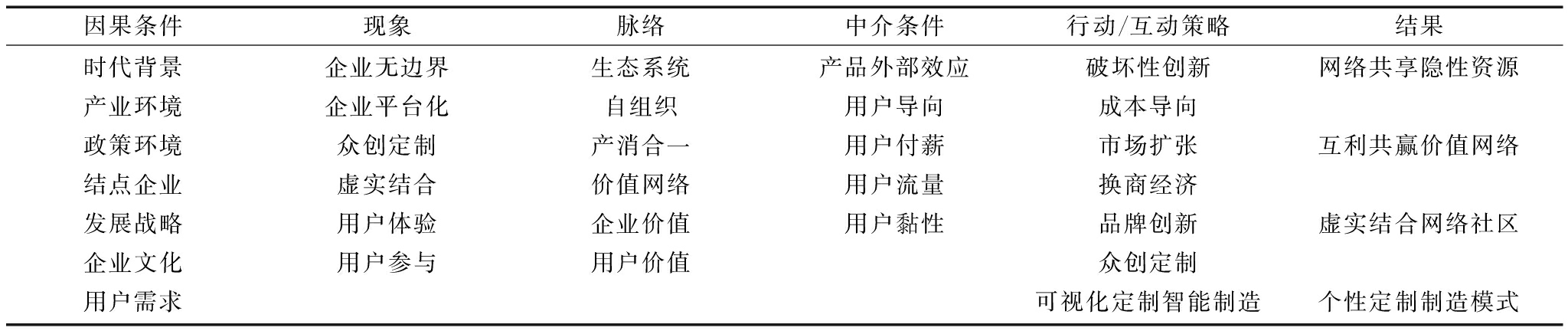因果条件现象脉络中介条件行动/互动策略结果时代背景产业环境政策环境结点企业发展战略企业文化用户需求企业无边界企业平台化众创定制虚实结合用户体验用户参与生态系统自组织产消合一价值网络企业价值用户价值产品外部效应用户导向用户付薪用户流量用户黏性破坏性创新成本导向市场扩张换商经济品牌创新众创定制可视化定制智能制造网络共享隐性资源互利共赢价值网络虚实结合网络社区个性定制制造模式