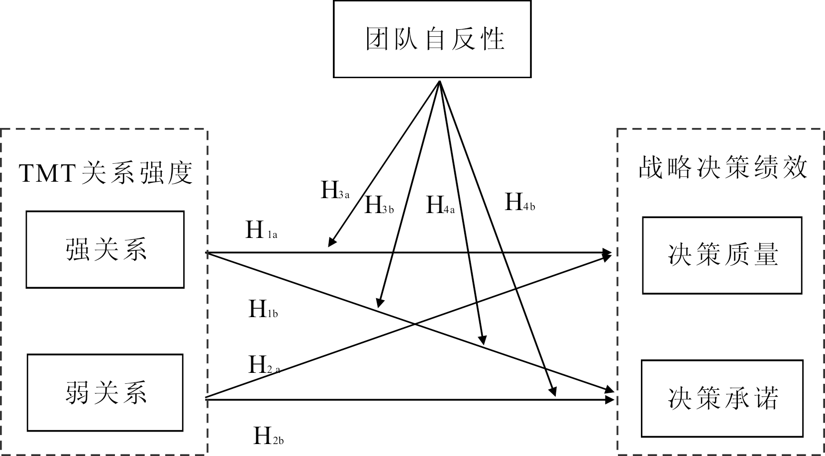 H3b:团队自反性调节TMT强关系与决策承诺之间的正向关系,团队自反性越高,这种正向关系越强。