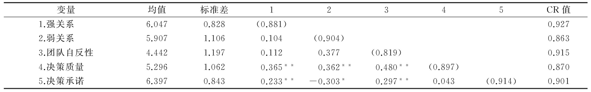变量均值标准差12345CR值1.强关系 6.0470.828(0.881)0.9272.弱关系 5.9071.1060.104(0.904)0.8633.团队自反性4.4421.1970.1120.377(0.819)0.9154.决策质量 5.2961.0620.365**0.362**0.480**(0.897)0.8705.决策承诺 6.3970.8430.233**-0.303*0.297**0.043(0.914)0.901