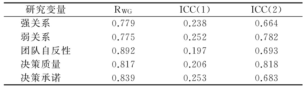 由于本研究的理论模型是基于团队层面建构的,而研究变量的测量数据均来自TMT成员个体,因此需要对TMT成员的评价数据进行团队层面的聚合检验。本研究采用组内一致性系数RWG、组内相关系数ICC(1)、ICC(2)等指标检验测量数据能否聚合到团队层面。从表2可知,本研究各变量的RWG均高于Lance等[41]推荐的标准值0.7,ICC(1)、ICC(2)也分别大于James等[42]提出的0.05和0.5的标准值。因此,本研究来自个体层面的5个变量数据能够有效聚合到团队层面上。