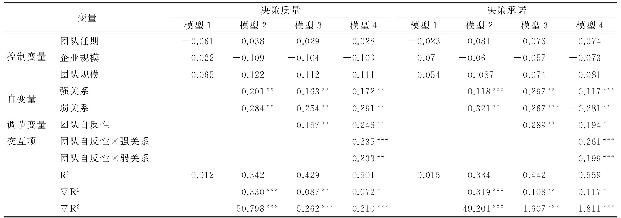 变量决策质量模型1模型2模型3模型4决策承诺模型1模型2模型3模型4控制变量团队任期-0.0610.0380.0290.028-0.0230.0810.0760.074企业规模0.022-0.109-0.104-0.1090.07-0.06-0.057-0.073团队规模0.0650.1220.1120.1110.0540.0870.0740.081自变量 强关系0.201**0.163**0.172**0.118***0.297**0.117***弱关系0.284**0.254**0.291**-0.321**-0.267***-0.281**调节变量团队自反性0.157**0.246**0.289**0.194*交互项 团队自反性×强关系0.235***0.261***团队自反性×弱关系0.233**0.199***R20.0120.3420.4290.5010.0150.3340.4420.559∇R20.330***0.087**0.072*0.319***0.108**0.117*∇R250.798***5.262***0.210***49.201***1.607***1.811***