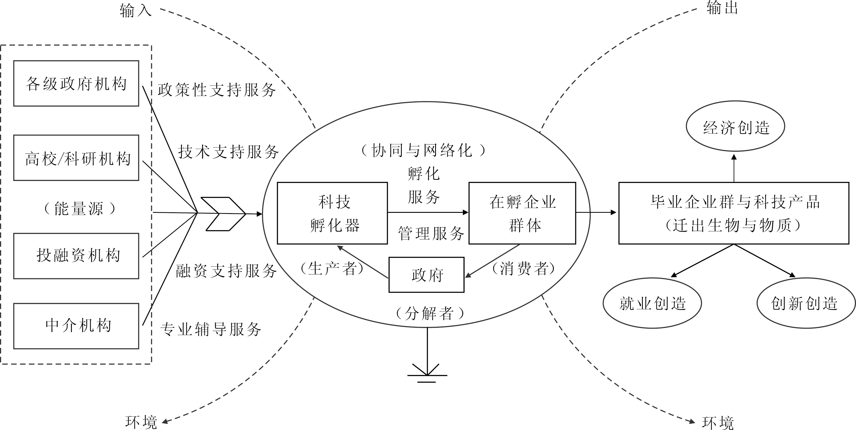 在科技孵化器生态系统中,科技孵化器是整个生态系统中的生产者,在孵企业群体是消费者,政府是分解者,各级政府机构、高校/科研机构、投融资机构、中介机构为能量源,迁出的“生物”与“物质”分别是毕业企业群与科技产品,毕业企业群与科技产品的现实效果是产生经济创造、就业创造与创新创造。