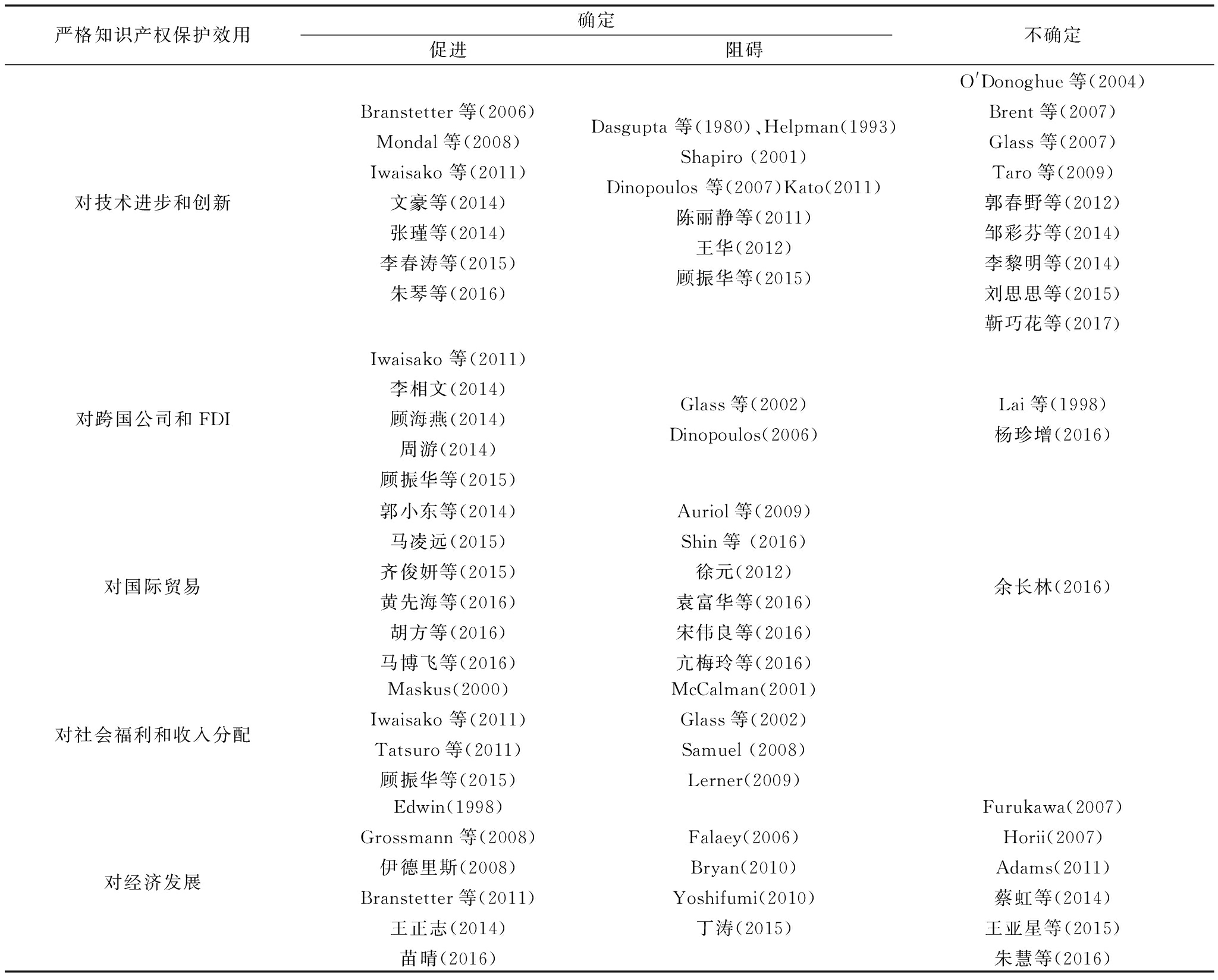 知识产权制度作为人类社会的一项重要制度创新,赋予知识创造者以私权,使得产权化知识具有“专属效应”,有利于激励科学进步和技术创新。同时,知识产权制度“以技术公开换市场垄断”的制度安排赋予社会整体以公共使用权,有利于国家甚至人类社会整体福祉的改善和提高。学者们或采用理论推导或进行实证检验,探讨严格知识产权保护对技术转移和创新、FDI、国际贸易、社会福利、收入分配及经济发展的作用,得出大相径庭甚至截然相反的结论(见表1)。知识产权制度最重要的功能体现在为知识产品提供市场化制度环境,合理分配不同主体之间基于知识产品产生的利益上[16]。然而,学者们对严格知识产权保护效用的研究得出不一致结论,这就需要对这一现象进行客观分析。