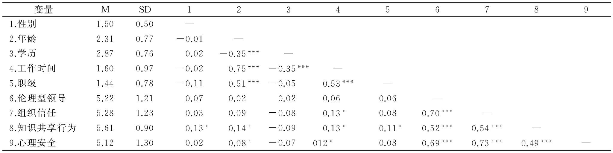 变量MSD1234567891.性别1.500.50—2.年龄2.310.77-0.01—3.学历2.870.760.02-0.35***—4.工作时间1.600.97-0.020.75***-0.35***—5.职级1.440.78-0.110.51***-0.050.53***—6.伦理型领导5.221.210.070.020.020.060.06—7.组织信任5.281.230.030.09-0.080.13*0.080.70***—8.知识共享行为5.610.900.13*0.14*-0.090.13*0.11*0.52***0.54***—9.心理安全5.121.300.020.08*-0.07012*0.080.69***0.73***0.49***—